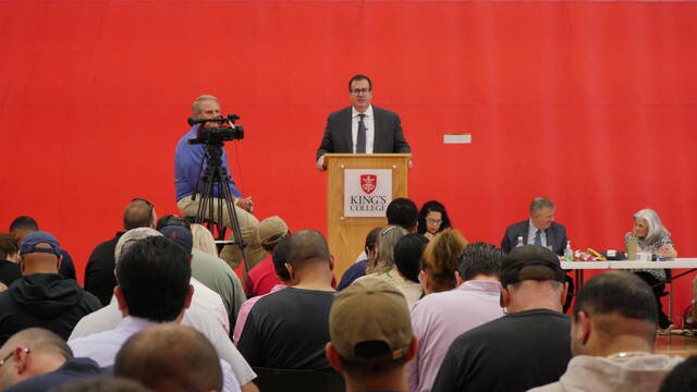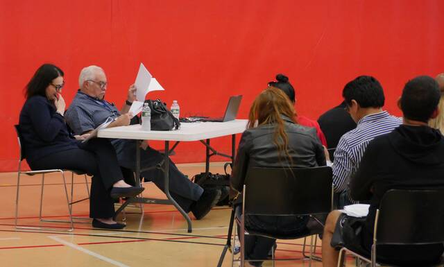 Sam Falcone, an attorney for Luzerne County’s tax-claim operator, Elite Revenue Solutions, presided over last week’s delinquent tax auction held at the King’s College Scandlon Gymnasium in Wilkes-Barre.