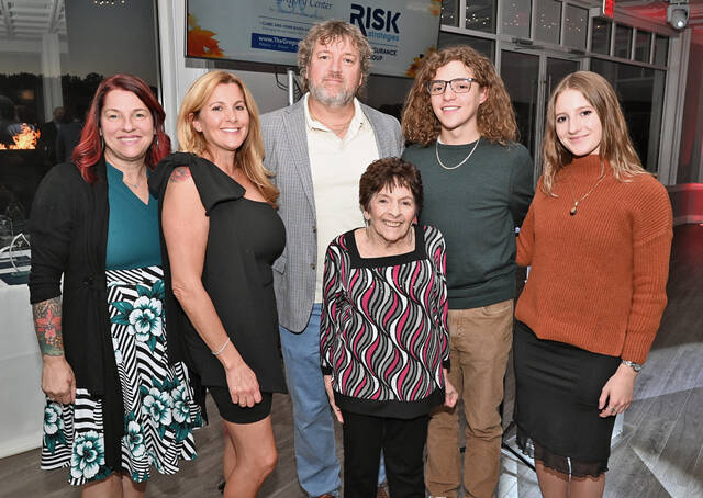 Rosella Fedor, the recipient of the Greater Pittston YMCA Sam Milazzo Volunteer of the Year Award, is shown with her daughter, Josette Curtis, former co-workers, and friends. From left: Fedor, Curtis, Rita Mauriello, Teddy Rabel and Karen Schall.