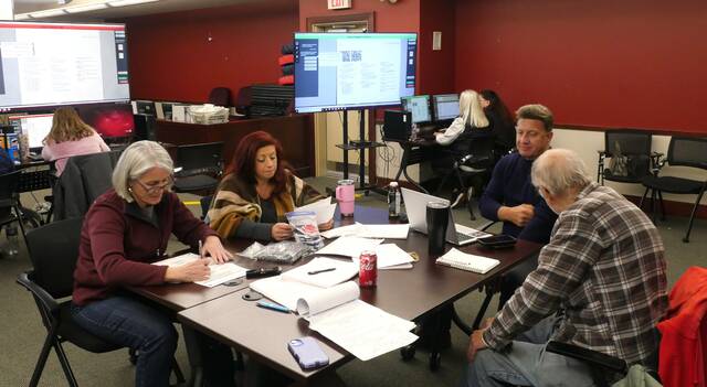 Luzerne County election officials review a ballot during Wednesday’s post-election adjudication. From left: county Election Board Chairwoman Christine Boyle, Board member Daniel Schramm, Board Vice Chairwoman Alyssa Fusaro and Election Director Emily Cook.