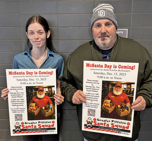 The Greater Pittston Santa Squad will be holding McSanta Day at McDonald’s on Route 315, Pittston, sponsored by Stella-Corbin McDonald’s, owners of the franchise, on Saturday, Dec. 13 . Consider donating a toy or monetary gift to the Santa Squad. All proceeds benefit children of Greater Pittston at Christmas time. Shown are Pittston McDonald’s Manager Lily Craig and Santa Squad founder and President Tony Marranca.