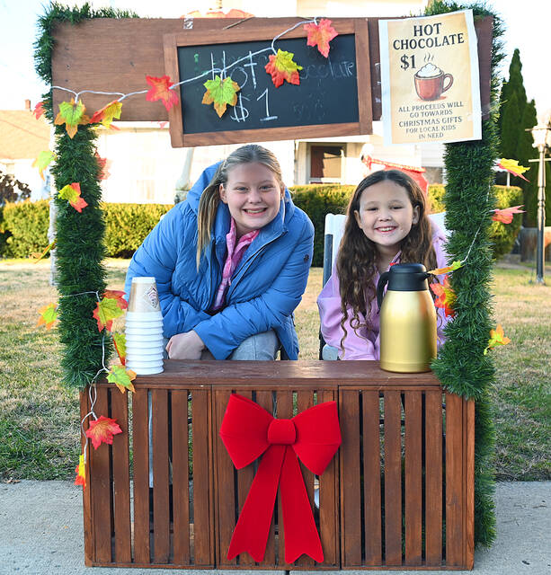 13-year-old Kaylin Fumia, left, and her sister, 6-year-old Natalie, have been selling hot chocolate to help support local children in need for Christmas. They will be selling hot chocolate from 3 to 5 p.m. daily through Thanksgiving at 192 Broad St., Pittston.