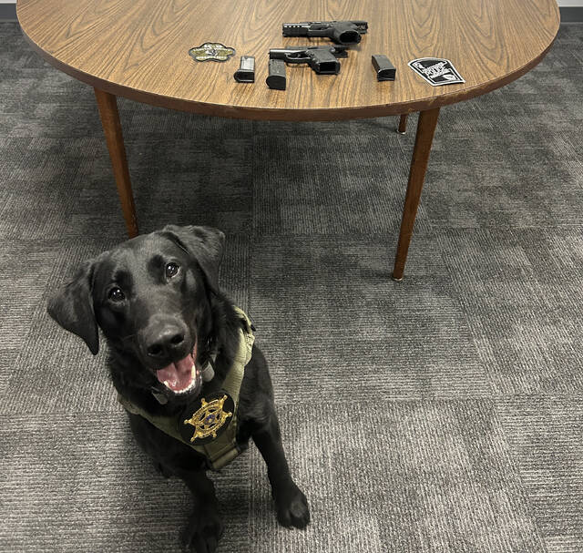 Luzerne County Sheriff’s Department K-9 Hylee is shown with her first on-duty find — a gun that was buried under a stack of clothes inside a bedroom dresser. After observing her skill, the suspect gave up a second gun and gun magazine, also on the table.
