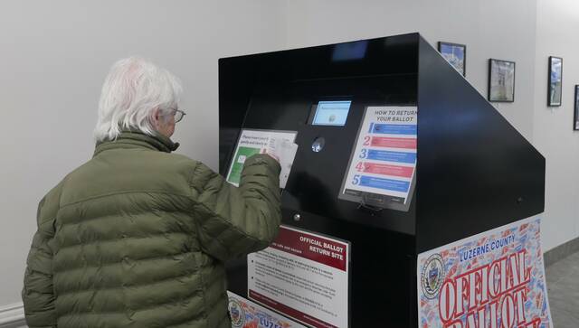 A Luzerne County resident feeds her Nov. 4 general election mail ballot into the drop box at the county’s Penn Place Building in downtown Wilkes-Barre. The drop box is supposed to capture images of the voters, but the county has been unable to retrieve those images as part of the county Election Board’s post-election spot-check review.