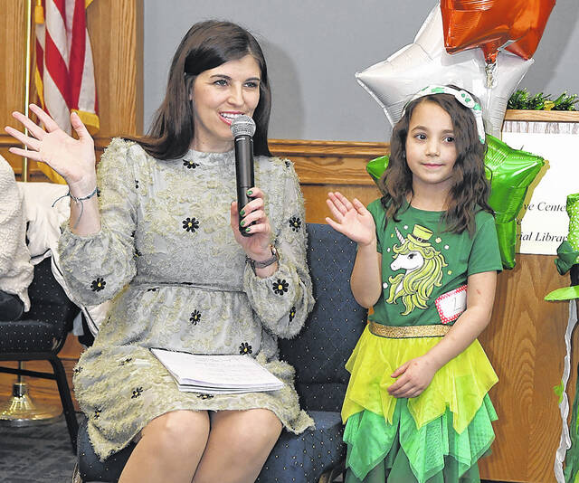 Pittston St. Patrick’s Little Miss and Little Mister Leprechaun host Sarah Donahue, left, has contestant Giavanna Maye wave to the audience during the 2022 contest.