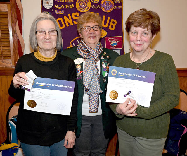 Lions District 14 Gov. Lee Sikora, center, presented certificates to Mary Jo Shillabeer, left, and Marylyn Querci, right, at the Jenkins Twp. Lions meeting.