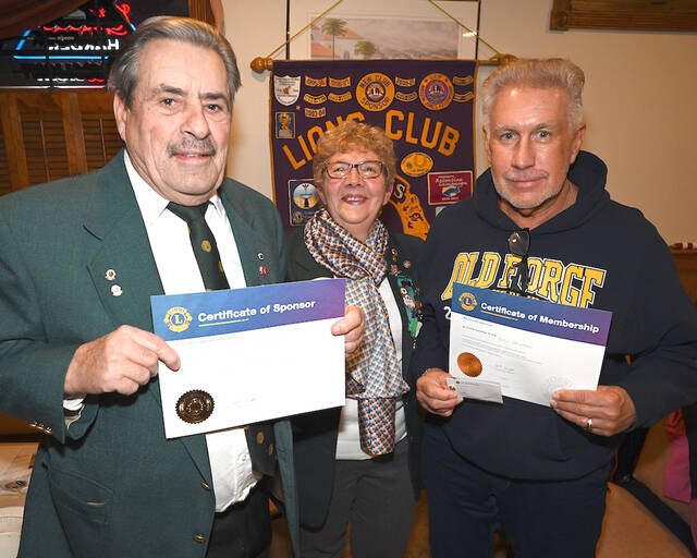 Stanley Rovinski, left, received a sponsorship certificate for sponsoring John Stuchkus, right, who received a certificate of membership with Lions District 14 Gov. Lee Sikora.