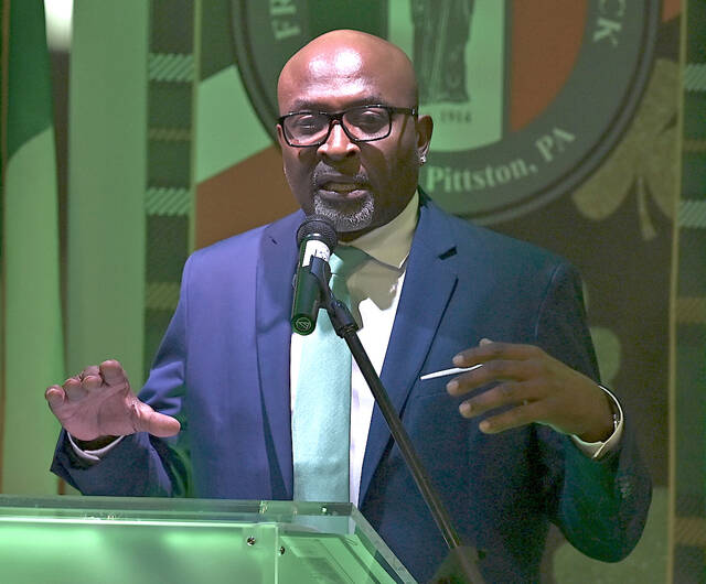 OJ McDuffie, former Penn State and Miami Dolphin standout, addressed the 2025 Greater Pittston St. Patrick’s Day Dinner at The Banks.