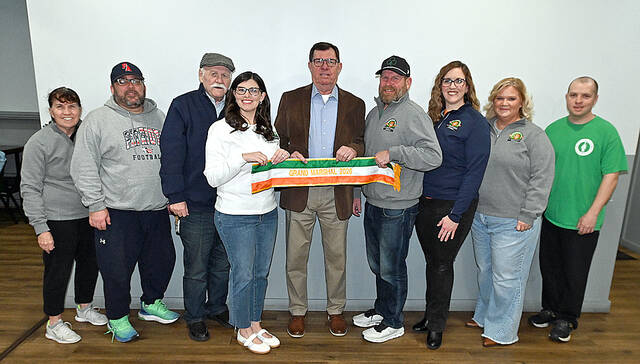 Members of the City of 2026 Pittston St. Patrick Parade committee are, left to right: Linda Bartlett, Greg Holl, Jim McFarland, Sarah Cianfichi, 2026 Grand Marshal Casey Donahue, Mike McFarland, Jessica Lane, Carrie Gundling, and Kevin O’Brien Jr.