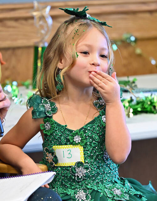 Vivienne Ruth Dante throws a kiss to those in attendance at the Cosgrove Room at the Pittston Memorial Library during the Little Miss and Little Mister Leprechaun contest.
