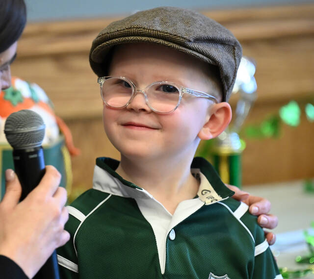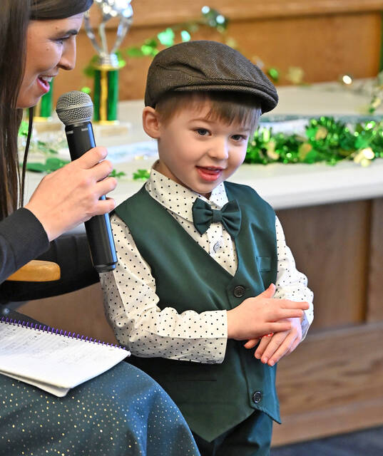 Little Mister Leprechaun contestant Jack Patrick McGarry ponders over his answer to a question asked by contest host Sarah Cianfischi.