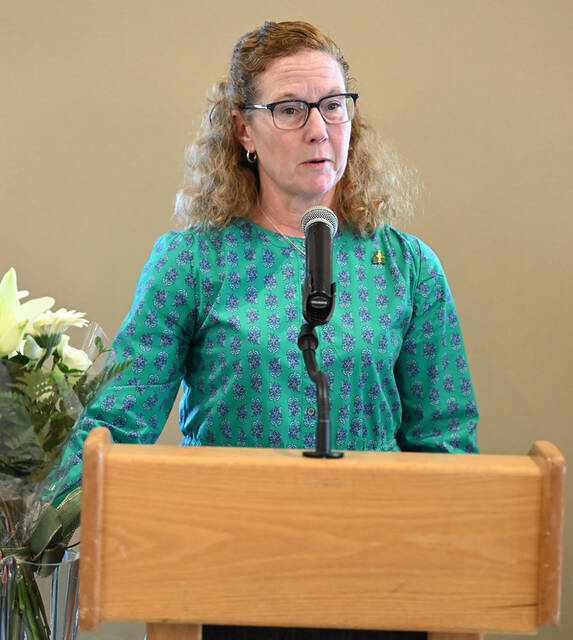 Sandra VanLuvender, the 2026 Greater Pittston Sons of St. Patrick Woman of the Year, accepted flowers and an award, speaks to the attendees of the brunch at Fox Hill Country Club.