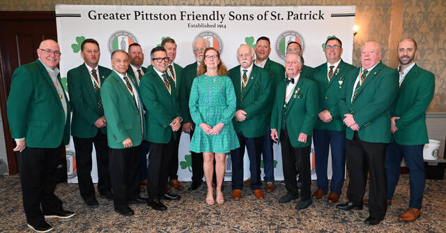Sandra VanLuvender, Greater Pittston Friendly Sons of St. Patrick Woman of the Year, center, stands with Friendly Sons past presidents. From left: Joe Long, Kevin O’Brien, Sr., Lee Monteforte, Mike McFarland, Errol O’Brien, Paul Leonard, John Gilligan, VanLuvender, Jim McFarland, Matt Meade, PJ Melvin, Patrick Gilligan, Shawn Brogan, James Rooney, and Sean Rooney.