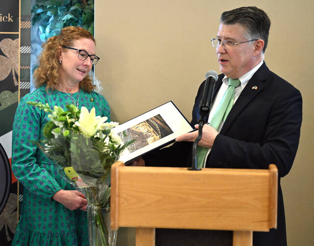 Sandra VanLuvender, Greater Pittston Friendly Sons of St. Patrick Woman of the Year, receives a citation from the Pennsylvania House of Representatives, delivered by State Rep. Jim Haddock.