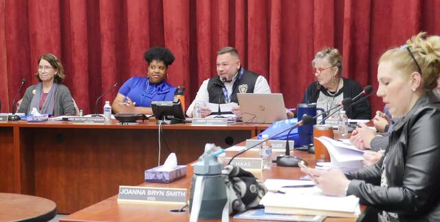 <p>Some Luzerne County Council members are shown listening to a presentation Tuesday. Visible, from left, are: Councilwoman Denise Williams, Vice Chairwoman Brittany Stephenson, Chairman Jimmy Sabatino, council clerk Sharon Lawrence, and Councilwoman Joanna Bryn Smith.</p>