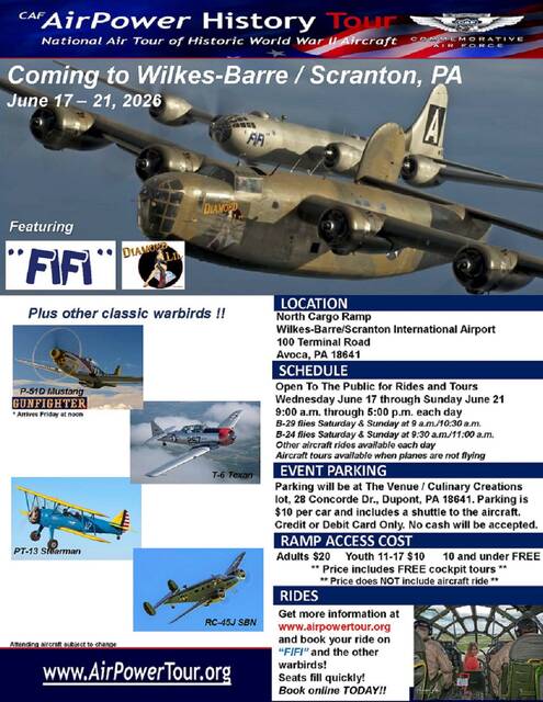 AVOCA — The distinctive rumble of radial engines from two of the rarest World War II bombers — the B-29 Superfortress “FIFI” and B-24 Liberator “Diamond Lil” — will be heard in the skies in June when they visit the Wilkes-Barre/Scranton International Airport as part of the AirPower History Tour of the Commemorative Air Force.