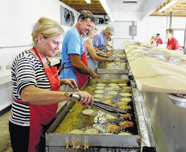 Bev Sharkey, left, and her husband Joe, both of Laflin, join other volunteers at the potato pancake grills at the St. Maria Goretti festival on Friday night.