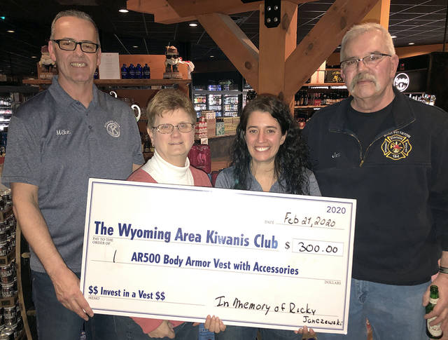 The Wyoming Area Kiwanis Club created a fundraising campaign for this year called “Invest in Vests,” with a goal of generating $21,000 to purchase 70-rifle plated vests and first aid kits for distribution to law enforcement officers, firefighters, EMS, Wyoming Area school resource officers and members of the Greater Pittston Ambulance Association who serve the West Side in the Wyoming Area School District territory.
