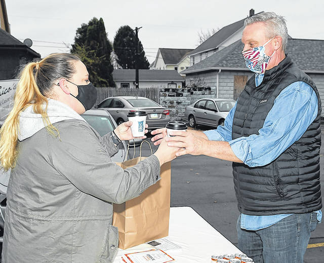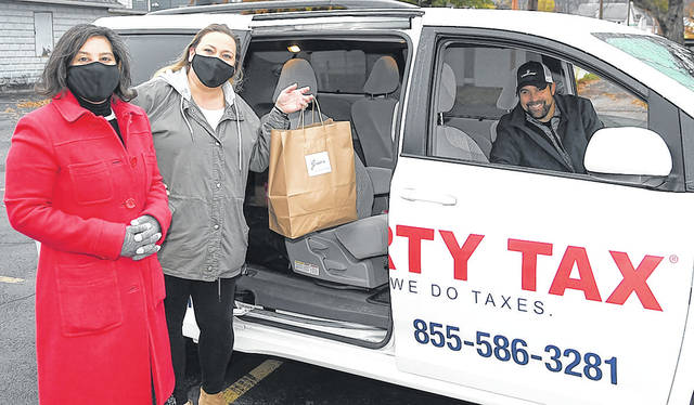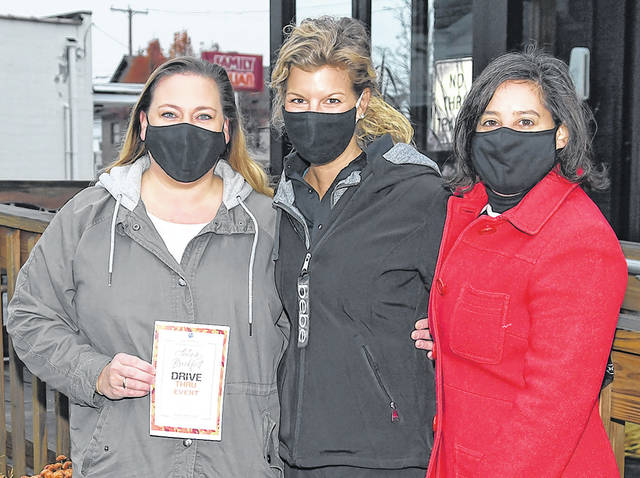 Brandi Bartush, left, and Michelle Mikitish, right, stand with Shauna Strellish of Grico’s Restaurant who hosted the drive-thru Autumn Breakfast held on Friday.
