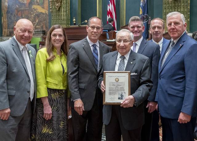 This photo was taken of State Senators with Pat Solano in October 2019, when the Pennsylvania Senate presented him with the Outstanding Citizen Recognition Certificate. From left: Senators Mario Scavello, Lisa Baker, Joe Scarnati, Patrick Solano, honoree; Senators John Yudichak, John Gordner, former Sen. John Blake. Solano died in January at age 95.