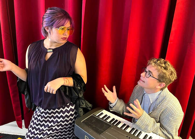 Will Broadway star Mona Monroe, played by Kayla Perez, left, of Greentown, be the ‘angel’ needed to finance the next production for Director Dick Foster, played by Camron Altenhain, right, of Moosic?