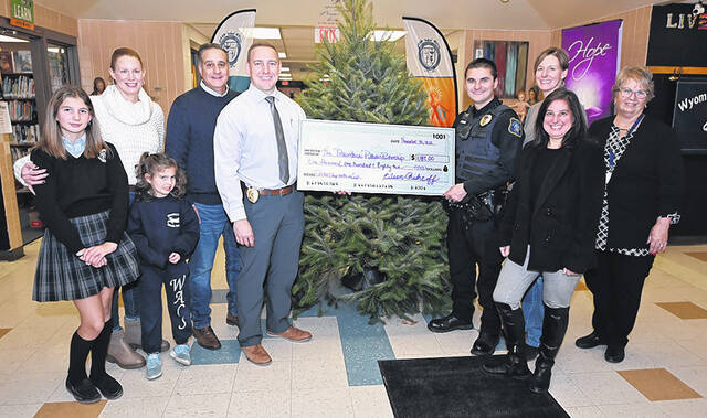 Wyoming Area Catholic School, Exeter, recently made a donation to the City of Pittston’s Shop with a Cop program in the amount of $1,182.00. The students and faculty members held a dress down day fundraiser to collect the money to donate the the Downtown Pittston Partnership. Standing, left to right: Holly Grace Emma, 10, Journey, 5, Karen Walsh-Emma, City of Pittston Mayor Michael Lombardo, City of Pittston Police Chief Kyle Shumonic, City of Pittston Ofc. Drew Malvizzi, City of Pittston Main Street Manager/Downtown Pittston Partnership Mary Kroptavich, Greater Pittston Chamber of Commerce Exec. VP Michelle Mikitish, Wyoming Area Catholic Principal Eileen Rischoff.