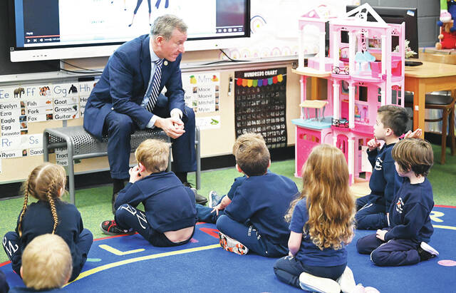 U.S. Rep. Matt Cartwright, D-Moosic, addresses a question by pre-schooler Ryan Rogers, far right, at Wyoming Area Catholic.