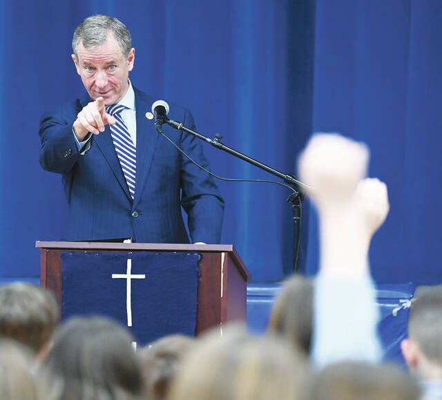 Students at Wyoming Area Catholic had plenty of questions for state Rep. Jim Haddock, left, during an assembly as a part of Catholic Schools Week.
