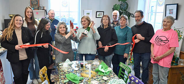 Tea & More owner/operator, Judy Passetti (with scissors), cuts the ribbon of the latest store at Downtown Pittston. Located on the first floor of the Reilly Building, Tea & More will serve breakfast and lunch items as well as an assortment of teas, caffeine-free teas, Polish teas, organic teas, and other beverages.