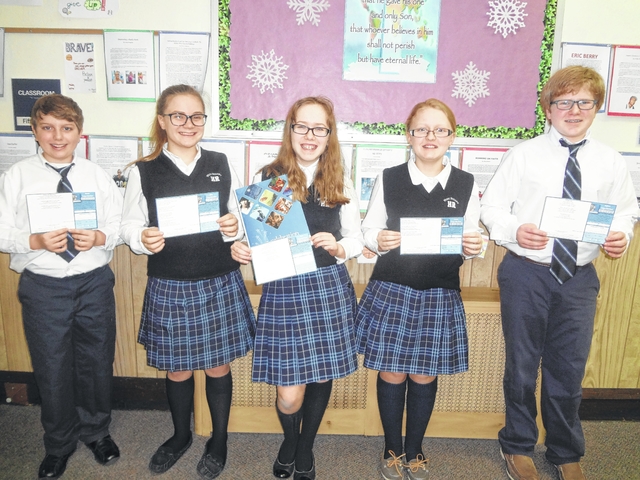 Sixth grade students from Holy Rosary School in Duryea recently had poetry pieces selected to be published in the Creative Communication, Anthology of Poetry, Celebration of Poets Fall 2015 book. Creative Communications is devoted to the appreciation of student writing. The top entries are published in an anthology that will record the creative insights of today’s student writers. Students who had their poetry accepted for publication are, from left, Hunter Acernese, Olivia Sennett, Dana Mackin, Lauren O’Brien and Andrew Francis.