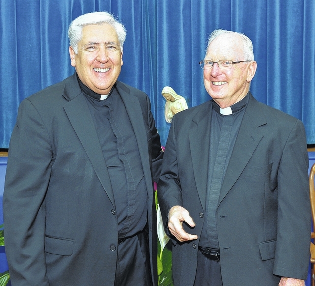 The setting for this story was the gymasium at Holy Rosary School where more than 200 parishioners gathered on June 28 to bid farewell to one shepherd and to welcome a new one.