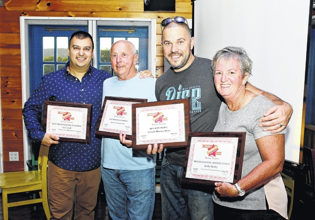 Crossfit Blarney Stone ‘work-out partners’ Sal Carroll, left, Judd Spencer, Judson Spencer, and Kathy Healey hold their awards.