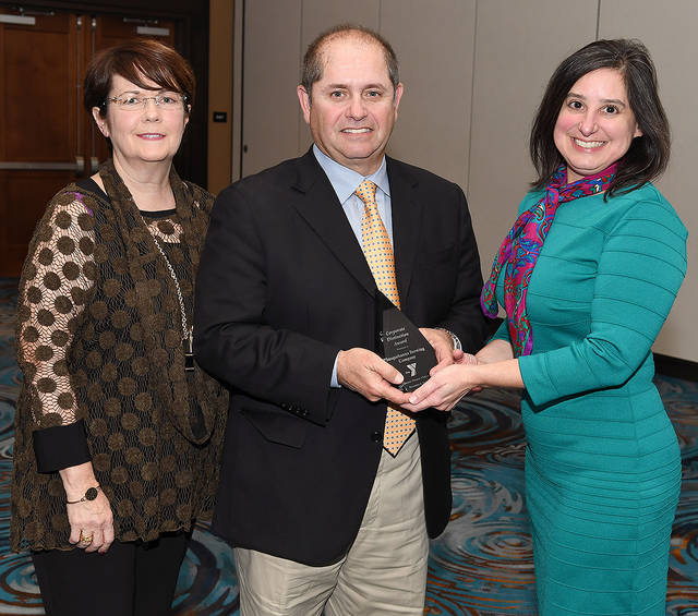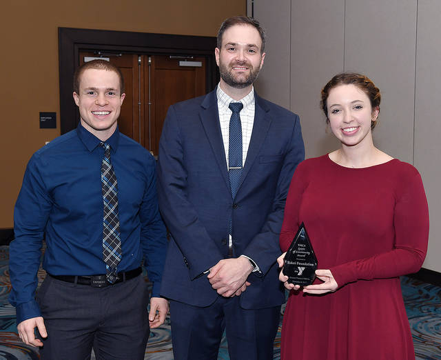 The 2017 YMCA Spirit of Community Award recipient is The Jennifer A. Sidari, M.D. Memorial Foundation. From left, are Peter Sidari, presenter John Brunza and Victoria Sidari.