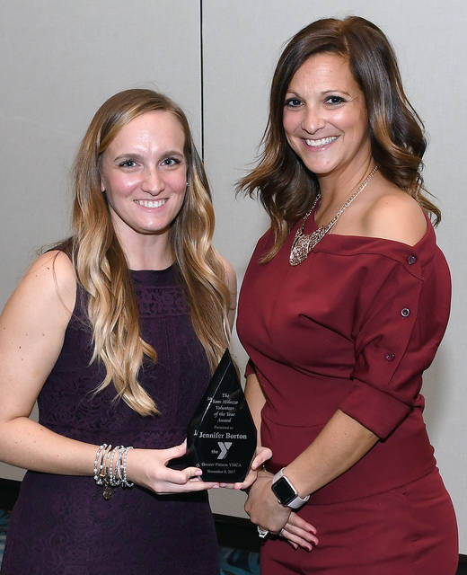 The 2017 YMCA Sam Milazzo Volunteer of Year Award is Jennifer Borton. Borton, left, is shown here with presenter Leslie Widdick, YMCA executive director.