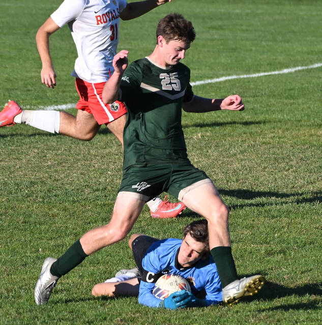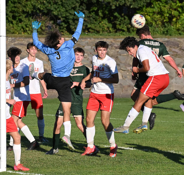 It was a mad scramble near Wyoming Area’s goal as the Warriors’ Jonas Kremski (25) got to the ball just a little late before Redeemer goalie Max Mohutsky.