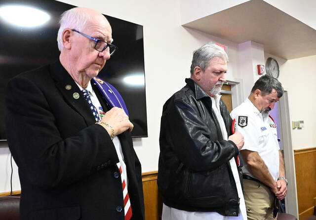 Members of the VFW Post 6518 pause for the National Anthem at the start of the Exeter Borough Veterans Day program. Shown are veterans, from left: Jerry Stofko, Sid Booth, and Jeff Donnora.