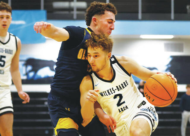 Wilkes-Barre Area’s David Jannuzzi (2) drives against Old Forge guard Ryan DeMarco in the third quarter.