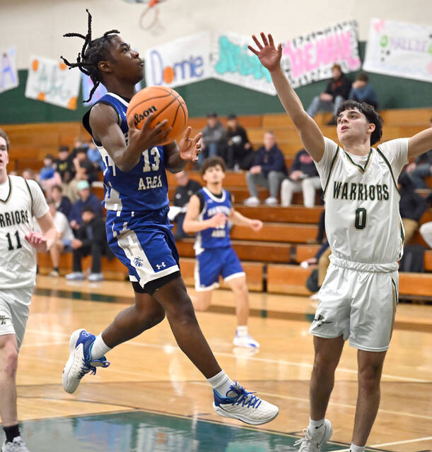 Wyoming Area started the third quarter with an cut to the basket by Bruno Pizzano and a layup by Shane Pepe off a turnover. The Warriors finished off the period with a 3-pointer by Casterlin when Pepe raced in to catch an airball and an inbound steal by Kopetchny — all in the final 10 seconds — for a 50-29 advantage.