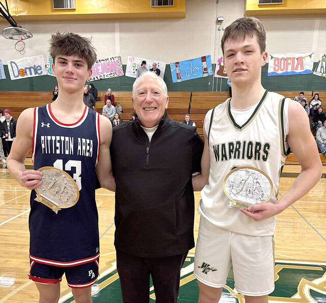 MVPs were chosen at the conclusion of the annual Eugene DeMinico, II Memorial Game, handed out by his father, Dr. Gene DeMinico, center, to Jacob Ivey, left, Pittston Area, and Luke Kopetchny, Wyoming Area.