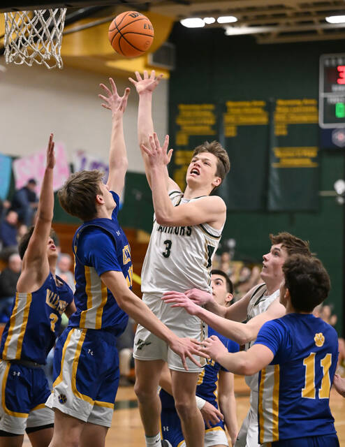 Wyoming Area junior Luke Kopetchny (3) tosses in a 2-point as he is surrounded by a host of Valley View Cougars at Wyoming Area on Feb. 24.
