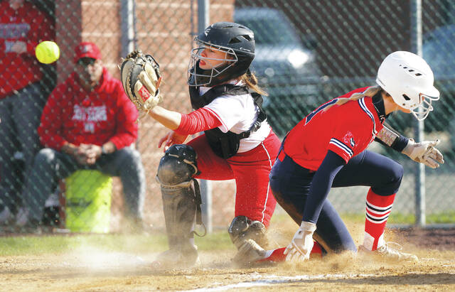 Pittston Area’s Kallie Booth scores in the second inning as Hazleton Area catcher Kelsie Peters waits for the ball to arrive Wednesday afternoon.