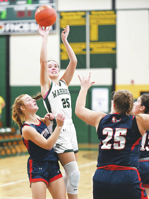 Morgan Janeski (25) hits a three-point basket in the first half for the Warriors. Janeski poured in a team high 12 points.