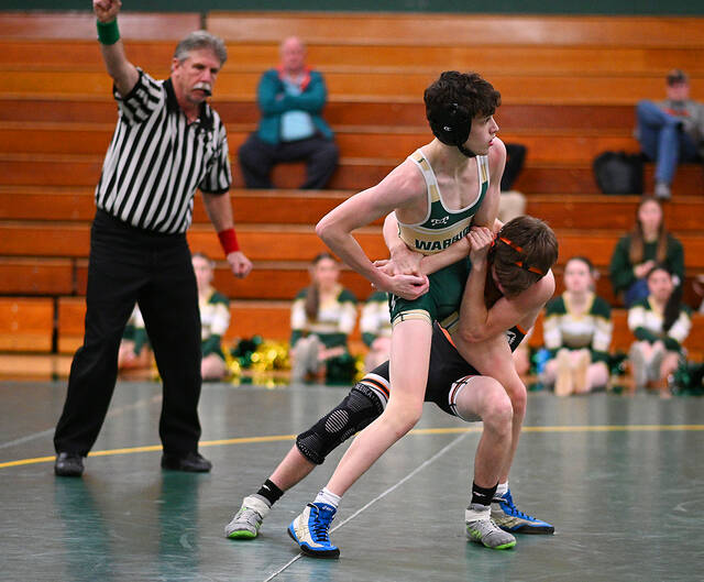 PIAA wrestling offical Dwight Barbacci awards Wyoming Area’s Connor Novakowski 2 points against Tunkhannock Area’s Taylor Daniels at 114 pounds. Daniels pinned Novakowski at 5:16 in the match.