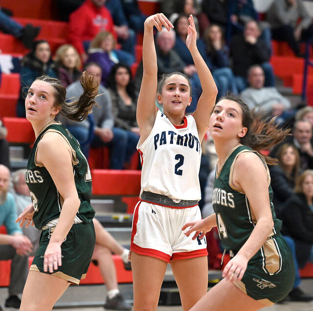 Pittston Area sharpshooter, Daniella Ranieli (2), hits for one of her three 3-point baskets for a game high 20 of the Patriots’ 41 points against Wyoming Area. Tony Callaio | For Sunday Dispatch