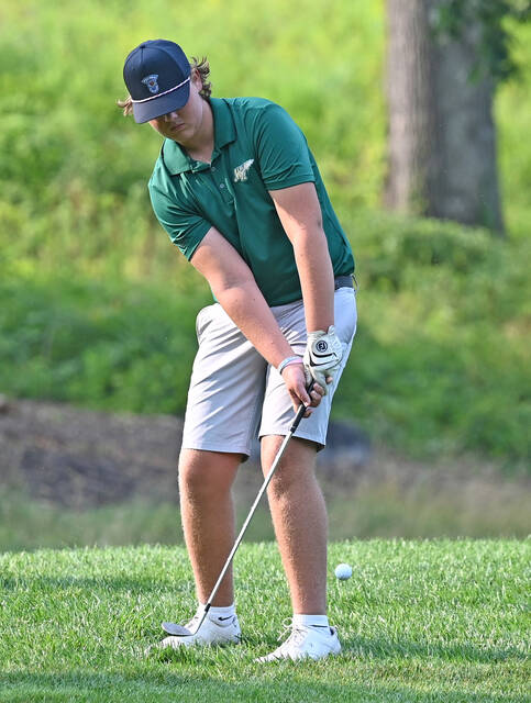 Wyoming Area junior Joey Day watches his ball head to the hole during match play against Berwick Area.
