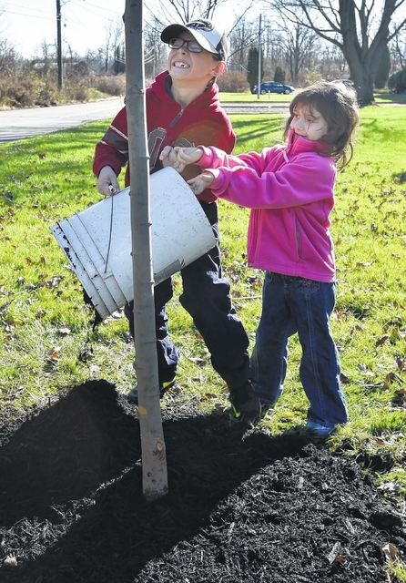 Bill, 8, and Natalia, 4, Mecca dump mulch on the newly planted tree in West Wyoming.
