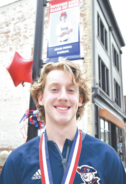 2020 Pittston Area graduate and baseball player Adam Penxa, standing underneath his banner, was one of 47 spring sports athletes honored on June 6, 2020 by the community.